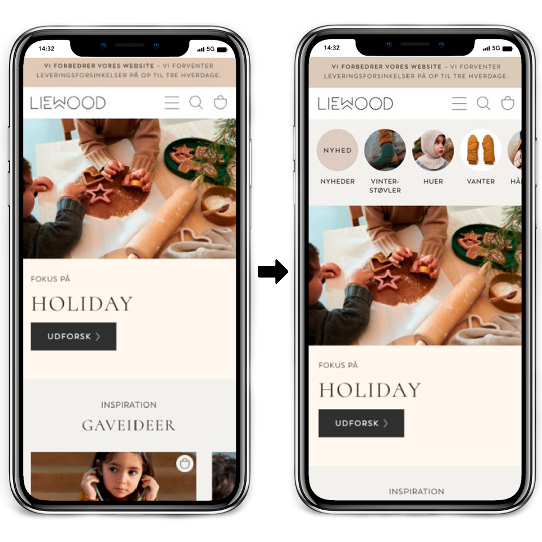 Til venstre er Liewoods forside før optimering og til højre er forsiden efter optimering.