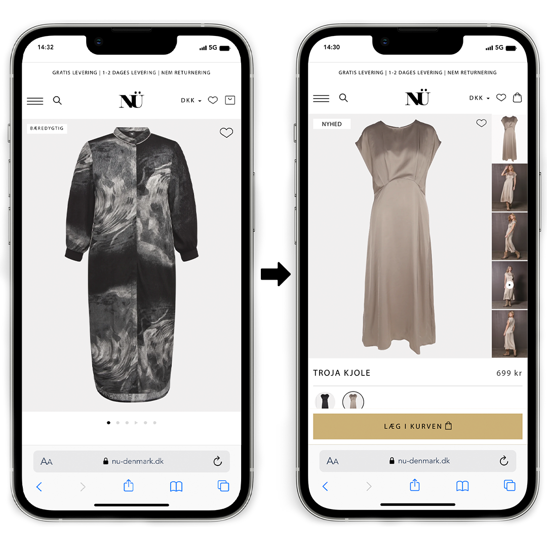 Til venstre er NÜ Denmarks produktside før optimering og til højre er produktsiden efter optimering.