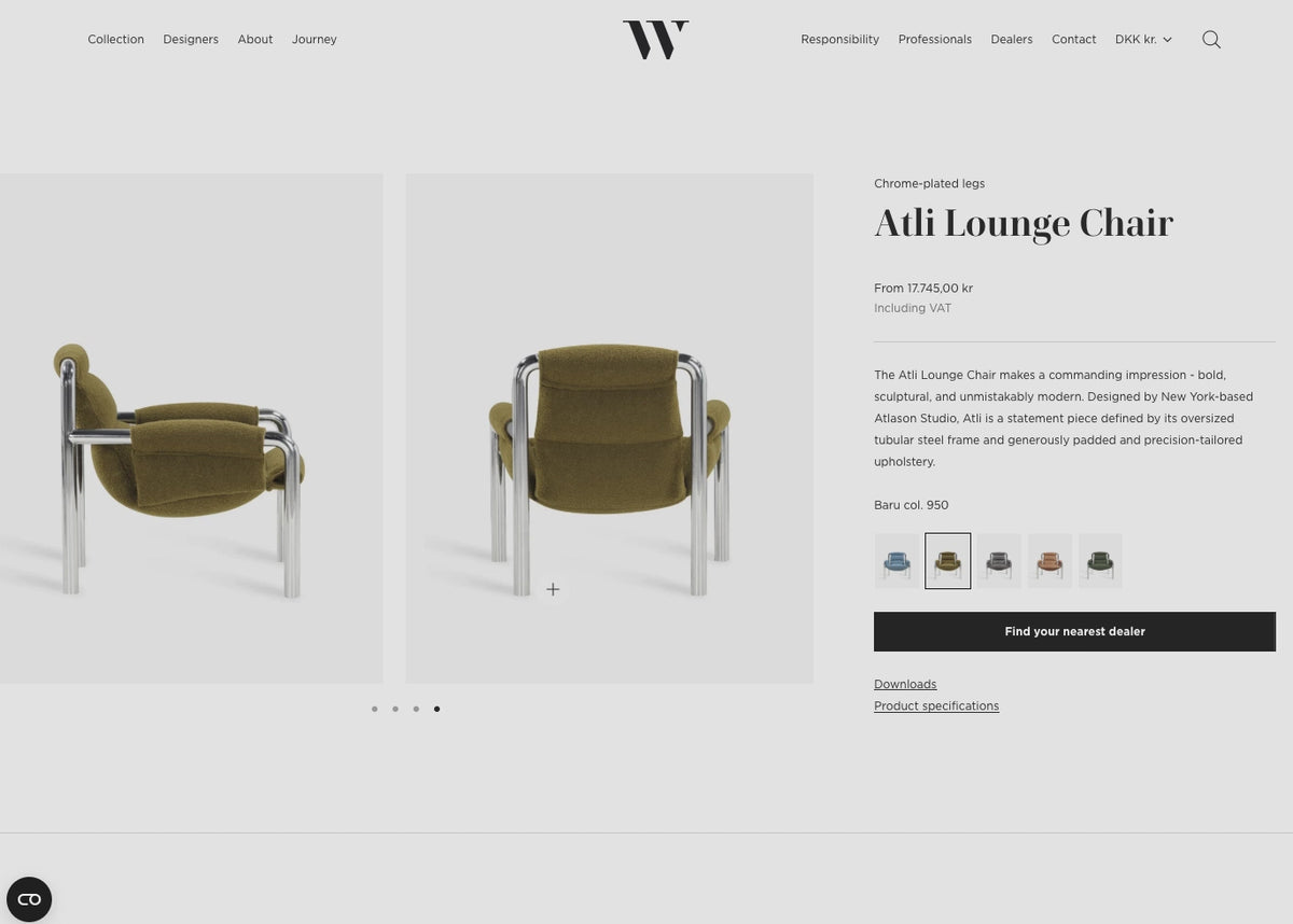 Designet på produktsiderne er løftet til at være moderne og stringent - præcis som Wendelbo. De mange stilfulde produktbilleder får lov at dominere, og det er let at danne sig et overblik over produktets varianter. Længere nede på siden har Wendelbo beriget produktsiderne med information om designeren, tankerne bag produktet, produktspecifikationer samt et relaterede produkter element, der navigerer til andre spændende møbler.